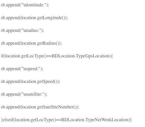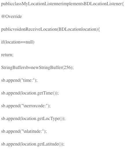 接着实现BDLocationListener接口。BDLocationListener接口有一个方法,作用是接收异步返回的定位结果,参数是BDLocation类型参数。其代码如下:
