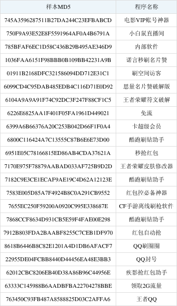 监测发现的部分Android勒索类病毒变种文件MD5和程序名称信息如下: